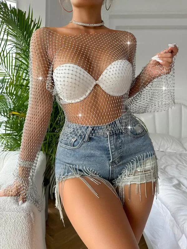 BAE Rhinestone Studded Fishnet Top Without Bra